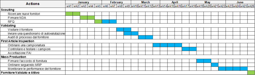 Poichè siamo buyer, vediamo un esempio di diagramma di Gantt per monitorare un tipico processo gestito dall’ufficio acquisti. Vogliamo cercare un nuovo fornitore per acquistare un nuovo componente, perciò dovremmo non solo metterci alla ricerca del partner ideale, ma validarlo, conftrollare i primi campioni e, finalmente, lanciare la produzione di massa. (Naturalmente siamo in un contesto di acquisto di materiali diretti destinai alla produzione ripetitiva, tipico delle aziende metalmeccaniche).