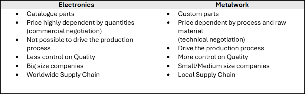 Partendo dalla mia esperienza personale, potrebbe essere interessante fare un confronto tra due diverse categorie: componenti elettronici e lavorazioni metalliche.”
